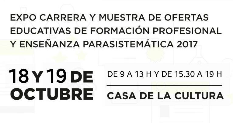 La Expo Carreras y la Muestra de Ofertas Educativas de Formación Profesional y Enseñanza Parasistemática, se lleva a cabo en la Casa de la Cultura, hoy 18 y mañana 19 de Octubre de 9.00 a 13.00 hs y de 15.30 a 19.00 hs.