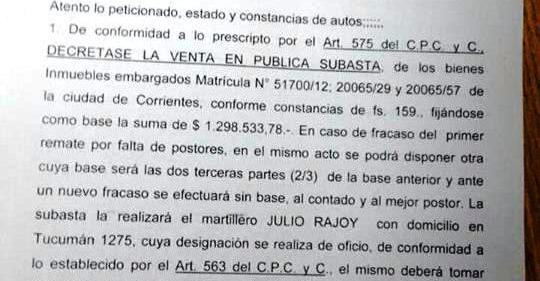 La Justicia provincial dispuso el remate de inmuebles por una suma millonaria contra el hijo del diputado radical Héctor Tito López, en el marco de un conflicto por estafa de una financiera que operó que Goya y que el hijo del legislador la habría manejado, según fuentes judiciales. Se trata de dos viviendas que que serán subastados antes del 20 de octubre por una suma inicial de 1.300.000 pesos, según el expediente judicial.