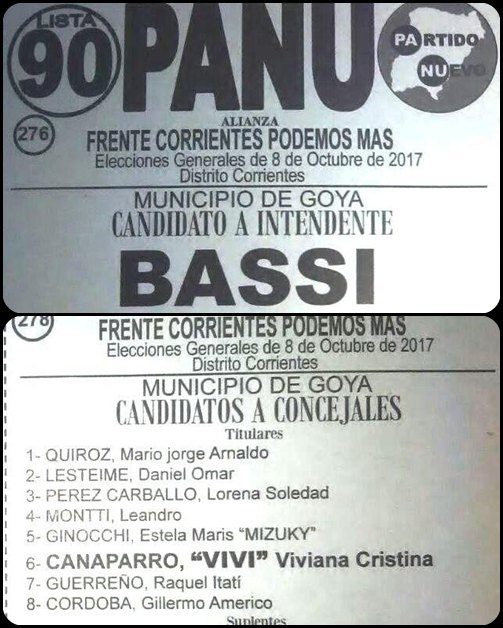 El Partido Nuevo promueve el corte de boleta contra Gustavo Valdés lo que juega a favor de Bassi en la Intendencia y de Camau Espínola para el cargo de Gobernador. En la cuna del surubi, la lista 90 del Partido Nuevo lleva como candidato a intendente al justicialista Bassi, como también a sus concejales, donde la nuevista Viviana Canaparro es candidata, con quien sus dirigentes hacen campaña todos los días en la localidad. Como en la Capital, Mercedes, Empedrado y otras ciudades del interior, los referentes del partido nuevo piden cortar la boleta en la parte de Gobernador donde está Gustavo Valdés y recomiendan votar por Camau Espínola y Nito Artaza.