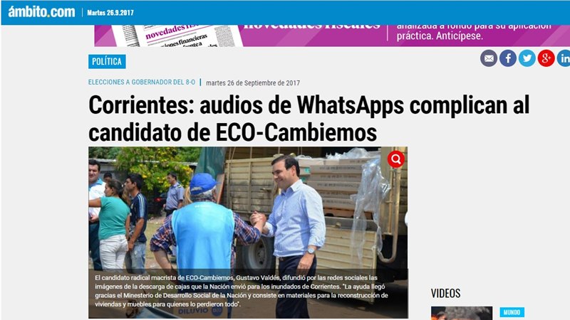 El candidato a gobernador Gustavo Valdés quedó envuelto en otro escándalo vinculado con el reparto de mercaderías y colchones en la campaña electoral de ECO+Cambiemos, cuando faltan menos de dos semanas para las elecciones del 8 octubre. Un joven, que tenía antecedentes penales, quedó detenido al señalado como la persona que difundió mensajes de audios que desataron el escándalo.