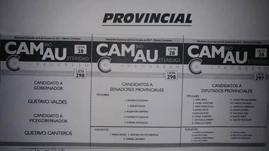 El candidato a gobernador Gustavo Valdes y Ricardo Colombi fueron autorizados, para presentar entre sus boletas, una que llevará como sigla “CAMAU”, el famoso apodo que, resaltará en la boleta de su contrincante, Carlos Mauricio “Camau” Espínola. Ante esto El concejal Pereira, alerto a todos los votantes, que Colombi y Osella llevan esta boleta escondida, le ponen CAMAU en grande, para tratar de pasar, ellos desapercibidos y robar votos ajenos. Esta boleta estará lamentablemente, autorizada por la justicia que tenemos, el 8 de octubre en el cuarto oscuro.
