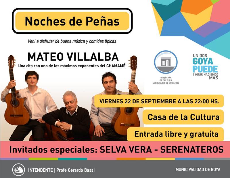El Municipio de Goya, a través de la Dirección de Cultura y Secretaría de Gobierno, invita a toda la comunidad para compartir, la noche del viernes 22 de Septiembre a partir de las 22:00, con uno de los máximos exponentes del Chamamé, Mateo Villaba. Además habrá invitados especiales, buena música y comidas típicas para degustar; con entrada libre y gratuita.