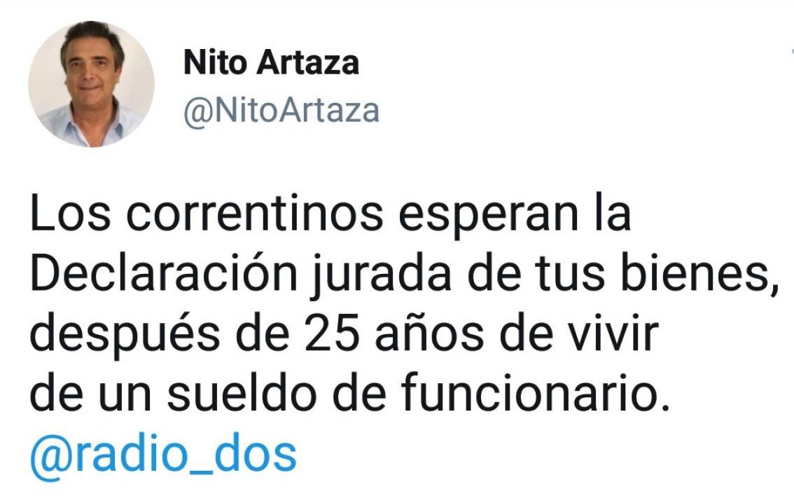 Rápido de reflejos, Nito Artaza utilizó la red del pajarito para responder a los dichos de Sergio Flinta en La Dos. "¿Qué te pasa Flinta, estás nervioso? Si hubieras tenido el coraje de presentarte a internas, hoy no llorarías como un cobarde", escribió el candidato a Vicegobernador.