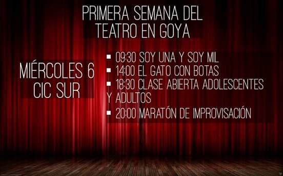 Comienza la Primera Semana del teatro en Goya. El grupo Teatro a Mano nos ofrece una variada gama de actividades teatrales para disfrutar, en el marco de un programa integral de cultura impulsado por el candidato a gobernador Camau Espínola y el profe Bassi. El lugar elegido para desarrollarlas es el playón pegado al CIC SUR. El miércoles 06 de septiembre comienza la maratón teatral, con funciones 9: 30, 14:00, 18:30 y 20 horas donde los niños podrán disfrutar de las Travesuras del “Gato con Botas”, Soy una soy mil (adaptación de Alfonsina Storni), clases abiertas a todo público y una maratón de improvisación. La inauguración oficial será junto a los candidatos a Intendente el profe Bassi y vice intendente Cecilia Gortari. Aquí el programa oficial de la semana.