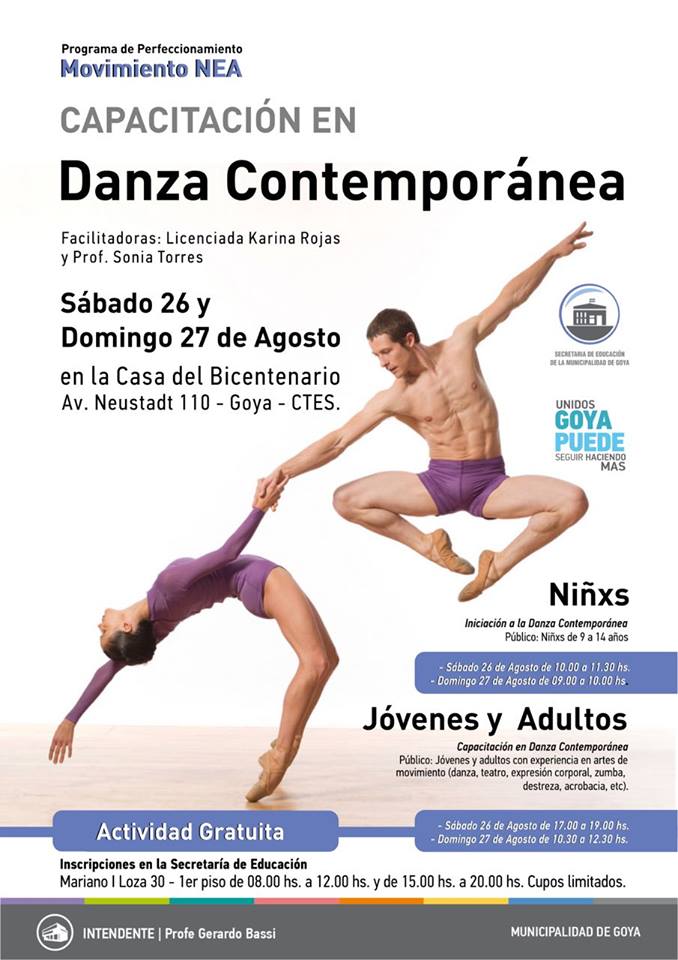 Una vez más, la Municipalidad de Goya junto a la gestión de Gerardo Bassi, presenta una nueva propuesta educativa. En esta oportunidad, se llevará a cabo la primera capacitación de Danza Contemporánea el próximo sábado 26 y domingo 27 de agosto en las instalaciones de la Casa del Bicentenario. Está destinado a adultos y niños que deseen generar nuevas experiencias artísticas.
