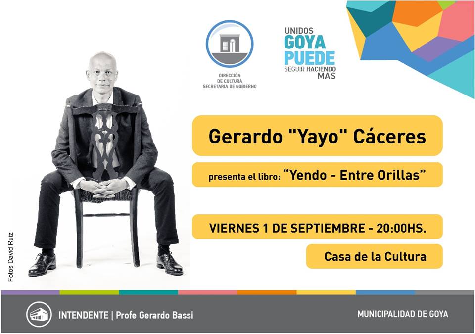 El próximo viernes 1 de septiembre a las 20 horas, la Municipalidad de Goya a través de la Dirección de Cultura, invita a toda la comunidad a presenciar la presentación del libro “Yendo – Entre Orillas”, en la “Casa de la Cultura” (Juan E. Martínez 687). Ésta es una obra del reconocido actor, músico, cantante y escritor curuzucuateño, “Yayo” Cáceres, quien hoy se encuentra radicado en España.