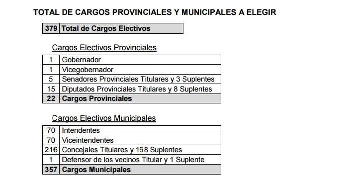 El sábado a las cero horas deberán estar inscriptas todas las listas de los cargos a cubrir por los diferentes frentes políticos que se disputaran los siguientes cargos electivos y se conocerán los nombres en cada una de sus categorias: 1 gobernador, 1 vicegobernador, 5 senadores provinciales titulares y 3 suplentes, 15 diputados provinciales titulares y 8 suplentes, en total 22 cargos provinciales, y además 357 cargos municipales, entre ellos, 70 intendentes, 70 viceintendentes, 216 concejales titulares y 168 suplentes y 1 defensor de los vecinos titular y 1 suplente.