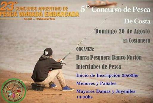 Este domingo 20 de agosto en la Costanera local, la barra pesquera Banco Nación y Comisión Interclubes Pesca Variada Goya organizan el 5to encuentro de Pesca de Costa para toda la familia, y en el marco de la 23 edición del Argentino de Pesca Variada Embarcada, con devolución a realizarse el 1,2 y 3 de septiembre en nuestra ciudad.