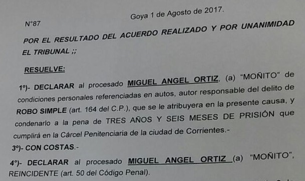 El TOP de Goya, condeno a “Moñito” Ortiz, a la pena de tres años y seis meses, de cumplimiento efectivo y lo declaran reincidente. Había robado motocicleta Honda Wave a una enfermera el 13 de Febrero de este año. La policía lo detuvo en la vía pública esa tarde, mientras transitaba con el rodado.