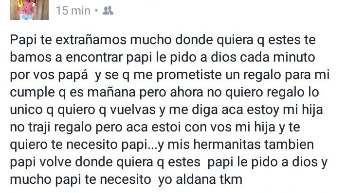 Una de las hijas de Rogelio Schweig, le escribió un mensaje en las redes sociales a su padre, hasta el momento desaparecido, en el Arroyo Guazú: "Papi, mañana es mi cumple..y el mejor regalo sería que vuelva, te extrañamos y queremos mucho", es parte de la conmovedora publicación.