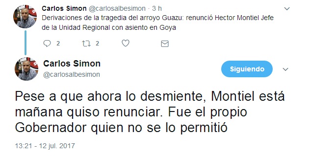 Desde relaciones institucionales de la Policía Provincial trascendió que no le fue aceptada por parte del gobernador Colombi la renuncia que presentó el jefe de la UR II de Goya, comisario Héctor Montiel, a consecuencia de la tragedia del puente del arroyo Guazú. Medios de toda la provincia se habían hecho ecos de la presentación, con carácter indeclinable, ahora Montiel sale y desmiente su alejamiento.