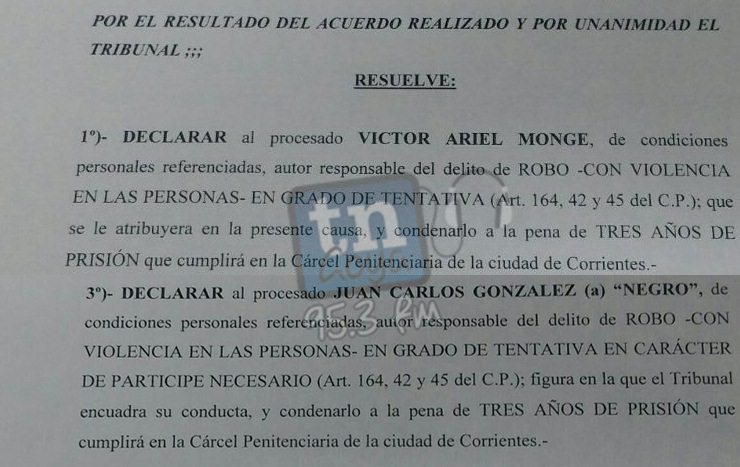 Jueces del TOP de Goya, condenaron a la pena de tres años de cumplimiento efectivo a Monge bajo la carátula; Robo con violencia en las personas en grado de tentativa, y a González por Robo n las personas en grado de tentativa en carácter de partícipe necesario y además a ambos lo declaran reincidentes. El hecho fue en Noviembre del 2016 a las 13 hs, cuando intentaron robar un bolso a Zini, transeúnte evitaron el ilícito, días más tarde fueron detenidos.