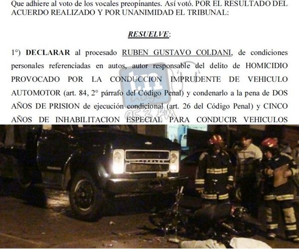 El TOP bajo la caratula; homicidio provocado por la conducción imprudente de vehículo automotor -Goya condeno a Coldani Rubén Gustavo, a la pena de DOS AÑOS DE PRISION de ejecución condicional y CINCO AÑOS DE INHABILITACION ESPECIAL PARA CONDUCIR VEHICULOS AUTOMOTORES, por un trágico hecho ocurrido el 5 de Julio del 2014, frente al corralón municipal, cuando el condenado salía a bordo de un camión Chevrolet, se movilizo en sentido contrario por el carril sentido este-oeste de Av. Sarmiento y es impactado de frente por una motocicleta, cuyo conductor de nombre JORGE PITTON CANAPARRO perdió la vida de forma instantánea.