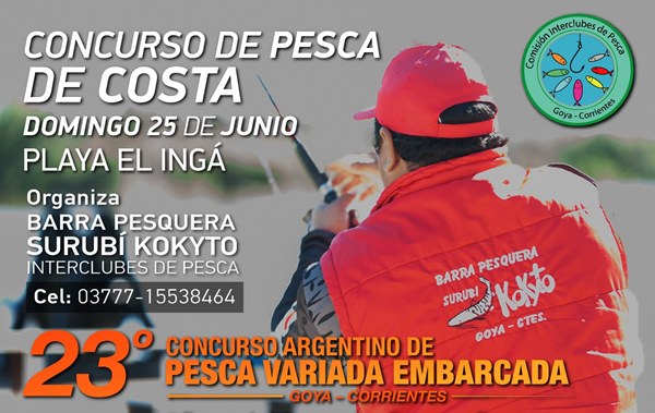 La barra pesquera “Surubi Kokyto” y la Comisión de Interclubes de Pesca Goya, invitan para este domingo 25 de junio a participar del torneo de pesca de costa, con devolución, a realizarse en El Ingá, a partir de las 9:00 de la mañana. El valor de inscripción menores $50 y mayores $100. Habrá importantes premios por categoría en órdenes de compra y artículos de pesca y camping.