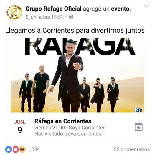 El legendario Grupo Rafaga llega a la ciudad de Goya para presentarse en el Predio Costa Surubi este viernes 9 de Junio. La banda que lidera actualmente Rodrigo Tapari llega por Primera Vez a la región de la mano de "El Signo Disco Producciones" y se prepara un gran espectáculo musical que contara ademas con dos bandas locales, Javier Caballero y Su Grupo Desvelo y el Grupo Fanaticos.