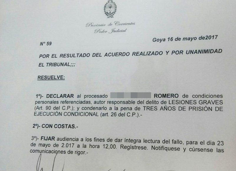 El TOP de Goya, condeno a un hombre que oficia de patovica en un boliche de la localidad de Esquina, el hecho ocurrió en Enero del 2012, cuando atacó a un joven que salía de una fiesta de 15. Según data en el expediente bajo la caratula; “Lesiones Graves”, le hizo una “traba” en el cuello hasta que perdió la conciencia, luego cae al piso, y comenzó a salir sangre por los oídos, además tuvo contusión cerebral hemorrágica. Los camaristas lo condenaron a tres años de ejecución condicional.