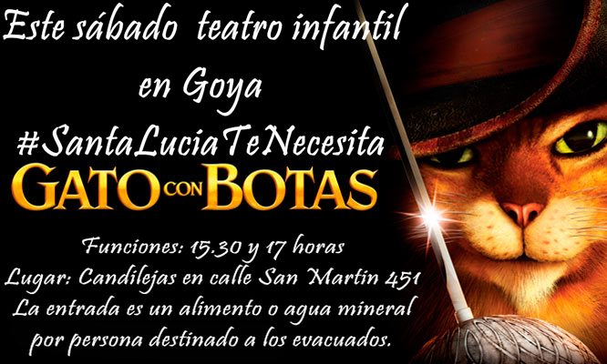 #SantaLuciaTeNecesita, así comienza la convocatoria para el sábado, día en que teatro a mano presentara la obra infantil “El Gato con Botas” en dos funciones, la primera a las 15.30 y la otra a las 17 horas. La entrada es un alimento, agua mineral o pañal por persona destinado a los evacuados. #CupoLimitado. El lugar: Candilejas ubicado en calle San Martin 451. La organización está a cargo de un numeroso grupo de voluntarios de Goya.