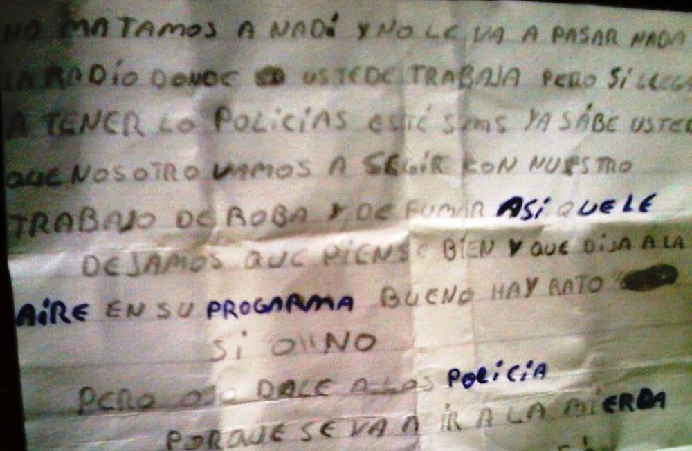 Es la segunda carta en un poco mas de 30 días que dejan en la radio, donde de forma intimidatorio se dirigen a Juan Cruz Velásquez luego de hablar del narcotráfico en Goya a través de su programa de radio que conduce junto a Fabián Armua por la 95.3 Radio TNGoya. La investigación ya está en marcha por vis judicial y mientras se desarrolla el proceso el cronista de TNGoya cuenta por custodia de la policía federal. Desde la dirección del medio anticiparon que si esto continúa así, evaluamos la posibilidad de cerrar TNGOYA.