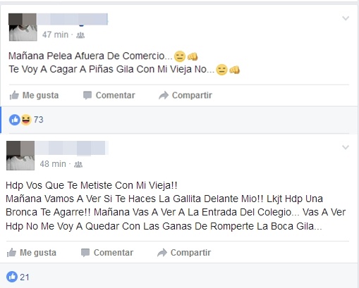 La violencia escolar en la ciudad parece no tener un párate. La “moda”, es agredirse, filmar y compartir vía WhatsApp o Facebook. Se auto convocan en las redes sociales, la semana pasada hubo enfrentamientos en horario de salida de Escuela Comercio. La bronca parece seguir, ahora una de ellas, publico en su cuenta de Facebook, “Mañana vas a ver a la entrada del Colegio”, los comentarios aparecieron y muchas se ofrecieron para sumarse a una supuesta golpiza hacia una compañera.