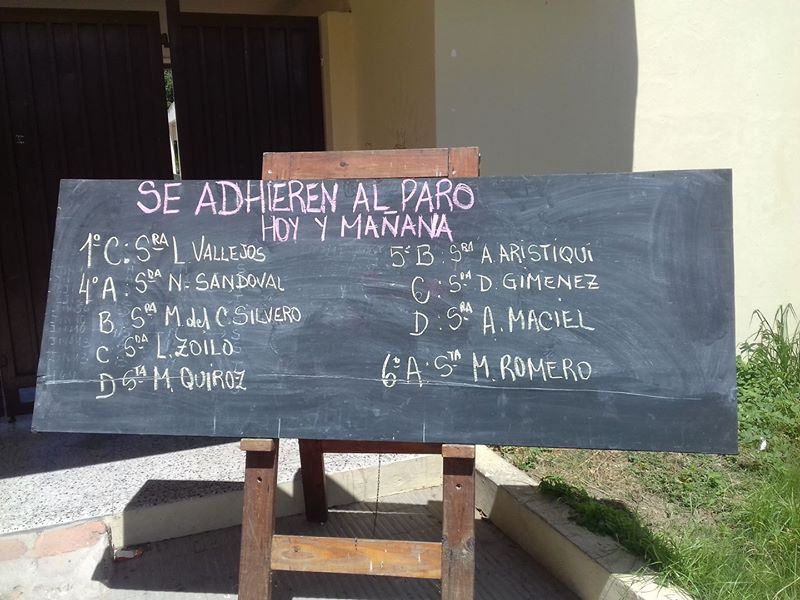 Una modalidad que llamo la atención se dio en la escuela del sur, donde en horas del medio día de ayer, un pizarrón en la puerta de entrada a la escuela, daba a conocer los apellidos de los docentes que se adherían al paro. Las redes sociales explotaron de mensajes, estas son algunas de las opiniones, donde algunos los calificaban de escrache.