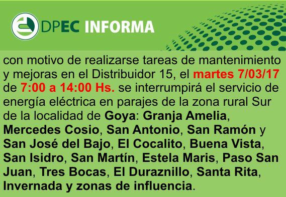 La Dirección Provincial de Energía, distrito Goya informó que hoy martes de 07 a 13 habrá corte de energía por reemplazo de postes en mal estado de la Línea de Media Tensión LMT troncal de paraje San Antonio, y afectará a la zona rural del departamento de Goya, desde Granja Amelia, Mercedes Cossio, San Antonio, San Ramón y San José del Bajo, El Cocalito, Buena Vista, San Isidro, San Martín, Stella Maris, Paso San Juan, Tres Bocas, Duraznillo, Santa Rita, Invernada y otros.