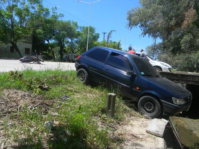 En la avenida del Trabajo y Tucumán, un motociclista que circulaba sentido este-oeste en contramano choca a un automóvil, ocasionando que quedara al borde del canal de desagüe ubicado al costado de la avenida. El conductor de la moto huyo del lugar.