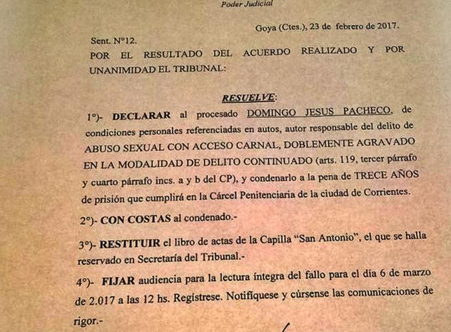 Tras los alegatos formulados esta mañana, el Tribunal Oral Penal de Goya condenó Domingo Jesús Pacheco, ex sacerdote, a cumplir 13 años de prisión por ser el autor responsable del delito de abuso sexual con acceso carnal, doblemente agravado en la modalidad de delito continuado.