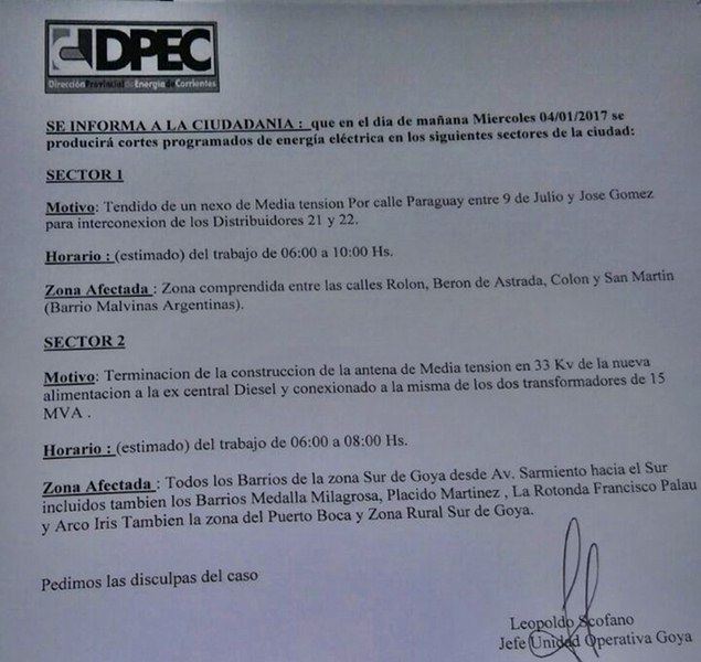 El jefe de la unidad operativa Goya, Leopoldo Scófano, informa a la ciudadanía en general que el día miércoles se producirán cortes programados en diferentes puntos. SECTOR 1: DE 06 A 10 HS, en tendido de media tensión en calle Paraguay entre 9 de Julio y José Gómez, distribuidores 21 y 22. Los afectados son, Av. Rolon, calles Berón de Estrada, Colon y San Martin, (Bº Malvinas Arg.) SECTOR 2: de 06 a 08 hs, todos los barrios de zona sur, desde Av. Sarmiento, incluido Puerto Boca y zona rural.