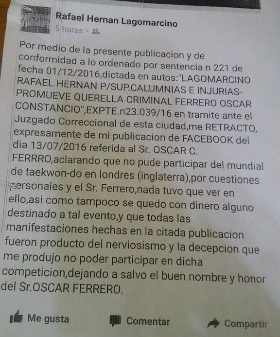Tras el fallo Nº 221 ordena al Señor Lagomarcino Rafael Hernán a retractarse tras los dichos realizados en su cuenta personal hacia el Señor Oscar Ferrero al quedar fuera del mundial de taekwon-do en Londres.