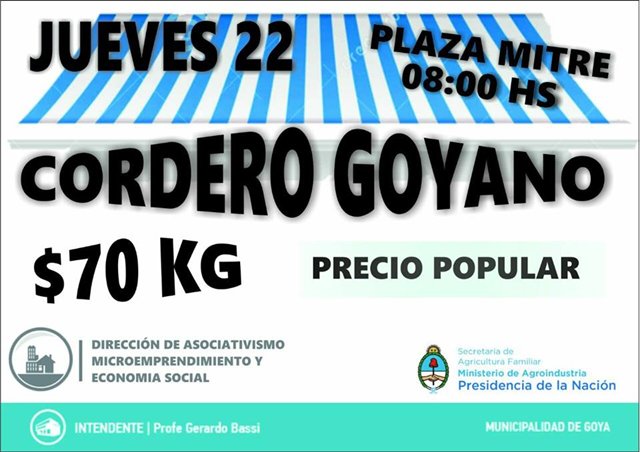 El jueves 22 de diciembre en Plaza Mitre, desde las 8:00 de la mañana y hasta agotar stock, agricultores familiares ofrecerán reses medias y completas de cordero a un precio económico por kilogramo. El Municipio de Goya articula gestiones con Nación, para promover el valor agregado en origen y proteger la economía social con precios populares.
