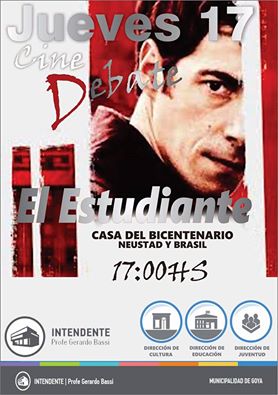 A partir de las 17:00 horas esta programado por dirección de juventud realizar un cine debate en la Casa del Bicentenario, ubicado en Av. Neustadt 110. Proyectaran la película “El estudiante” de Santiago Mitre, al finalizar se debatirá sobre las distintas políticas estudiantiles y juveniles que atañen a los centros de estudiantes y militantes jóvenes.
