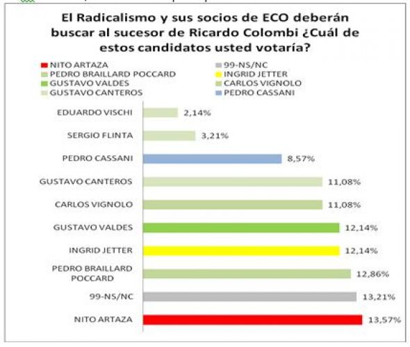 El listado completo es el siguiente: Carlos Espínola (37,86%); Ns/Nc (11,79%); Fabián Ríos (9,64%); Pedro Braillard Poccard (6,79%); Gustavo Canteros (6,43%); Nito Artaza (6,07%); Gustavo Valdés (4,29%); Pedro Cassani (3,21%); Carlos Vignolo (3,21%); Sergio Flinta (1,43%), Eduardo Vischi (1,07%).