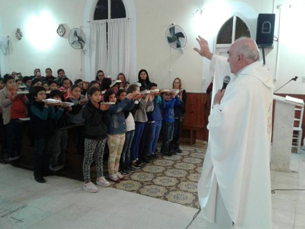 El párroco Enrique Domínguez, misionero redentorista, presidió la Misa de entrega de los Nuevos Testamentos y del Libro de la Palabra de Dios a los niños que asisten al primer año de la catequesis familiar en el marco del “Mes de la Biblia” en la capilla Virgen del Carmen. Participaron catequistas y familiares de los niños de CAFA 1.