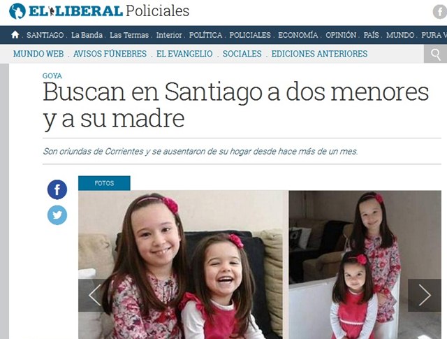 El Ministerio Público de Santiago del Estero, mediante requerimiento por oficio del Juzgado de Primera Instancia de Familia con competencia en Menores de Goya, Corrientes, difunde la búsqueda y localización de las niñas Abril Agostina Tomasella, de 9 años de edad y de Julieta Tomasella de 4 años; ambas de tez blanca, cabellos castaños oscuro y ojos marrones; y de su progenitora Carla Romina Pipaón (DNI: 26.234.826), de 28 años, de tez blanca, cabello color rubio y ojos color celeste. Se requiere a cualquier persona que pueda aportar datos sobre sus paraderos que se comunique y dé aviso urgente al Juez de la causa comunicándose al teléfono 03777-422114.