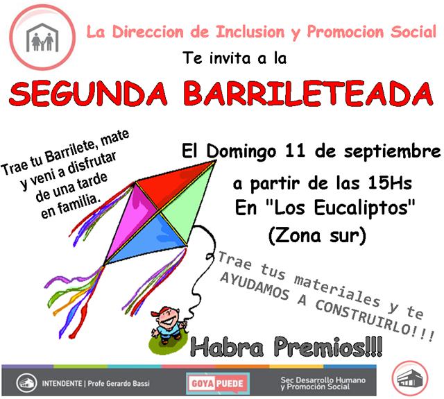 Organizado por la Municipalidad de Goya, a través de dirección de Inclusión y Promoción Social a cargo de la doctora Lorena Pérez Carballo, este domingo se realizó con total éxito la 2da Gran Barrileteada, en el playón del barrio Los Eucaliptos. Estuvo presente el intendente Gerardo Bassi quien compartió un momento de alegría con los niños de la zona Sur y las familias.