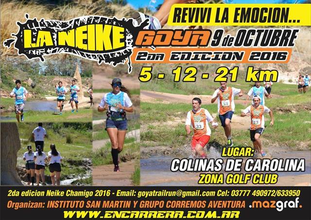 El Instituto San Martín de nuestra ciudad junto corremos aventuras de Goya están organizando la 2da. Edición de la carrera de aventura “LA NEIKE” que se realizara en Colinas de Carolina en la zona del Golf Club de nuestra ciudad el dia 9 de octubre con las distancias de 5-12 y 21Km. y que contará como es tradicional con una gran cantidad de corredores de distintos puntos del país .