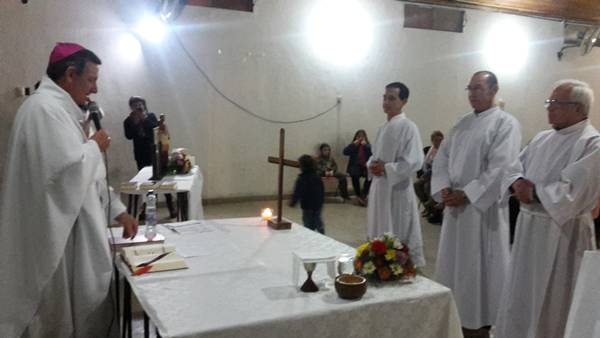 El Obispo de Goya, Adolfo Ramón Canecín, por imposición de sus manos y la fuerza del Espíritu Santo instituyó como lectores en orden al diaconado permanente a los señores Antonio Aníbal Santiago Ayala, Daniel Orlando Brandan y Carlos Norberto Defilipi, durante la misa que presidió en la tarde del lunes 29 de agosto de 2.016 en el marco de novena en honor a San Ramón Nonato, en Monte Caseros.
