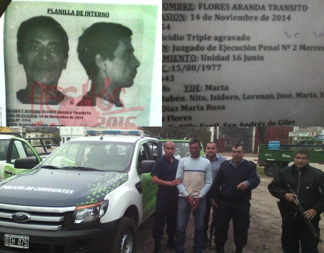 Personal policial del Priar de Goya, recapturo a un sujeto identificado como Transito Flores Aranda, estaba oculto en el paraje Stella Maris en la cuarta sección. Cumplía condena en la Unidad Penal 16 de Junín, tenía salidas transitorias, el 14 de Noviembre del 2014, salió bajo este beneficio y no volvió a la cárcel. Desde hace más de 30 días dicho personal realizo inteligencia y logro dar con el condenado, informaron al cronista Juan Cruz Velásquez. IMAGEN