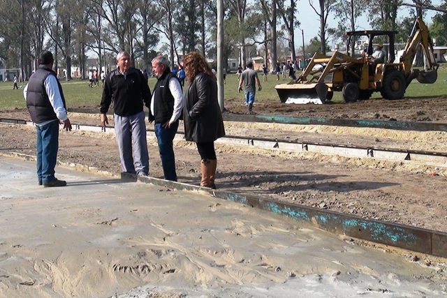 El secretario municipal de Obras Públicas, Luís Domingo Vicentín mostró al intendente Gerardo Bassi las obras de construcción a nuevo del playón deportivo en el Barrio Los Eucaliptos. Explicó a la prensa que si bien los vecinos solicitaron una refacción, el intendente decidió que debía demolerse y construir desde cero.
