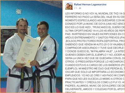 El deportista Rafael Hernán Lagomarcino quedo fuera del torneo mundial y realizo una fuerte denuncia en su cuenta de facebook diciendo lo siguiente (Textual): Les informo que no voy al mundial de taekwondo ya q mi inst. sup. Oscar Ferrero no pago la seña del viaje en su debido momento especulando, así quedarse con mi parte del dinero donado por la municipalidad de Goya (una vez vencido el plazo límite) y eso es lo que hizo , truncando el sueño de mi vida y quizás ultima oportunidad ya a los 40 años de representar a nuestro país invirtiendo en viajes inscripciones en competencias, arduos entrenamientos y gastos previos (pasaporte ,bolsos, protectores ropa deportiva, proteínas y etc.).