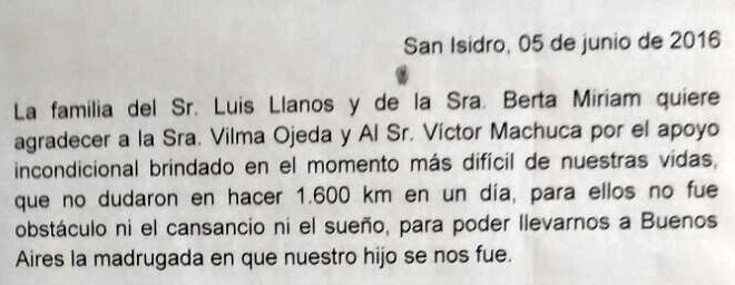 En el día martes la municipalidad de San Isidro recibió nota de agradecimiento dirigida al intendente de la misma la señora Vilma Ojeda y a su esposo el señor Víctor Machuca tras su participación desinteresada, ante los sucesos inesperados de una familia.