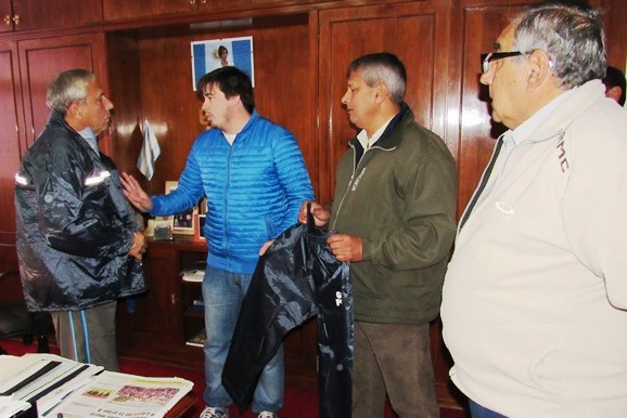 El intendente de Goya, Gerardo Bassi, junto al director de Servicios Públicos, Nicolás D’Aveta y los encargados de turnos mañana y tarde, Ramón Medina y Julio Parodi, entregaron indumentaria para lluvia a todo el personal que presta servicios en las calles de la ciudad. El acto simbólico fue llevado a cabo este martes en el Salón de Acuerdos del palacio comunal.