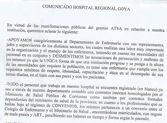 El gremio ATSA corrientes con sus delegados se encuentran en el Hospital regional d Goya en apoyo al reclamo por parte del personal, quienes están realizando una retención de servicios en las áreas; laboratorios, consultorios externos, entre otros. En la guardia solo atienden urgencias.