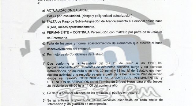 El personal del hospital zonal Camilo Muniagurria de Goya denuncia que hay una falta de actualización salarial respecto al pago del ítem por Insalubridad (riesgo y peligrosidad); tampoco se ha abonado la sobreasignación de arancelamiento al personal desde hace aproximadamente 6 meses. Ante la falta de respuestas por parte de las autoridades del centro de salud goyano y del Ministerio de Salud Pública se realizarán el próximo jueves 30 retenciones de servicios en distintos turnos.