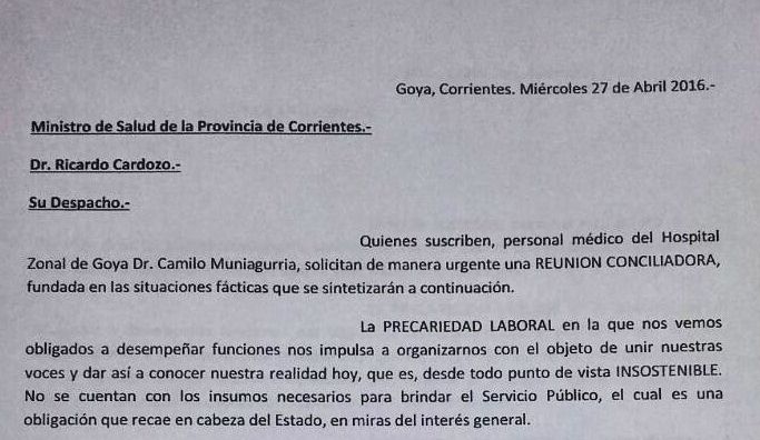 Médicos del Hospital zonal Dr. Camilo Muniagurria solicitan una reunión con el ministro de salud de la provincia para hacerle saber en las condiciones que trabajan de absoluta precariedad en insumos como así también regularizar sueldos del personal ya que son los más bajos del país.