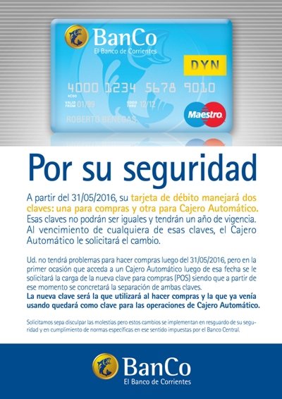 Para mayor seguridad el Banco de Corrientes impone doble resguardo en las tarjetas a partir del martes 31 de mayo de 2016. La tarjeta de débito MAESTRO manejará dos claves: una para compras y otra para el Cajero Automático.