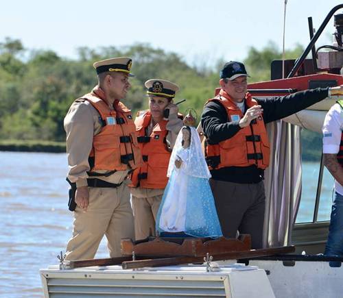 El obispo diocesano monseñor Adolfo Ramón Canecin, con una imagen de la Virgen de Itati, a bordo de un guardacosta de la Prefectura Naval Argentina, recorrió el Riacho Goya en los minutos previos a la largada de las embarcaciones en la 41º Fiesta Nacional del Surubí. El prelado impartió su bendición a los participantes del concurso nacional de pesca y saludo a la multitud que se congregó en la costanera local.