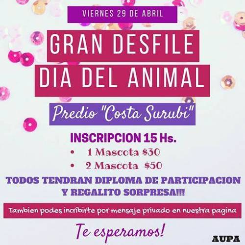 AUPA invita al gran desfile de mascotas que se llevará a cabo en el marco de nuestra Fiesta Mayor, el viernes 29 de abril (Día del Animal) en el Predio Costa Surubí.