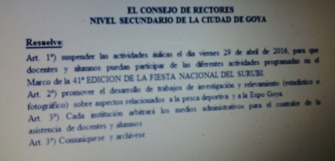 Tras la reunión del Consejo de rectores de nivel secundario de Goya, se decidió suspender las actividades áulicas en algunos establecimientos el viernes 29 de abril de 2016 en las escuelas del nivel secundario de nuestra ciudad, en el marco de la 41º fiesta Nacional de Surubí, para que docentes y alumnado puedan participar de los diferentes eventos de nuestra fiesta. Los colegios que hasta el momento darán clases en Goya son; Hispano, Sagrado Corazón de Jesús, Comercial, Normal y Magdalena Güemes de Tejada. En tanto los colegios de zona rural, tendrán clases, Buena Vista, Ifran y Carolina.