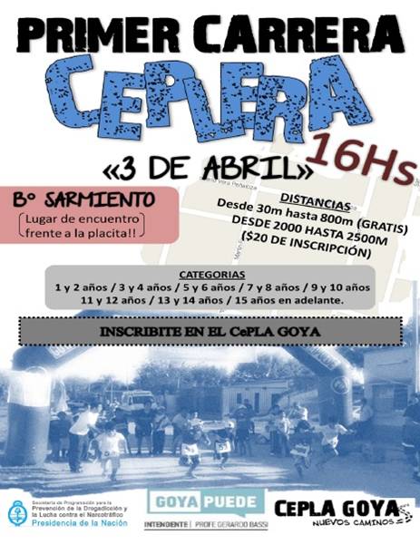 Organizado por el CEPLA Nuevos Caminos y auspiciado por Secretaría de Programación para la Prevención de la Drogadicción, este domingo 3 de abril a partir de las 16 horas se realizará la 1era Carrera CEPLERA. Evento del cual también participa el grupo Goya Corre. Están invitados a concurrir jóvenes de los barrios: Sarmiento, Matadero, San Ramón, Arco iris y Esperanza.